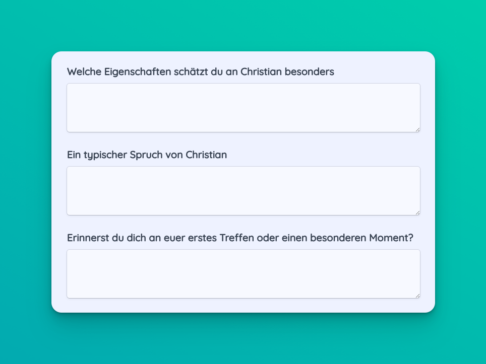 With the newest update, we are now able to generate forms to gather content way more flexible. This allows us to address new audiences, for example birthday communities or wedding guests. We can basically ask any question you have in mind to your contributors. While currently done in background, we soon plan to publish an editor that will allow you to do this yourself.